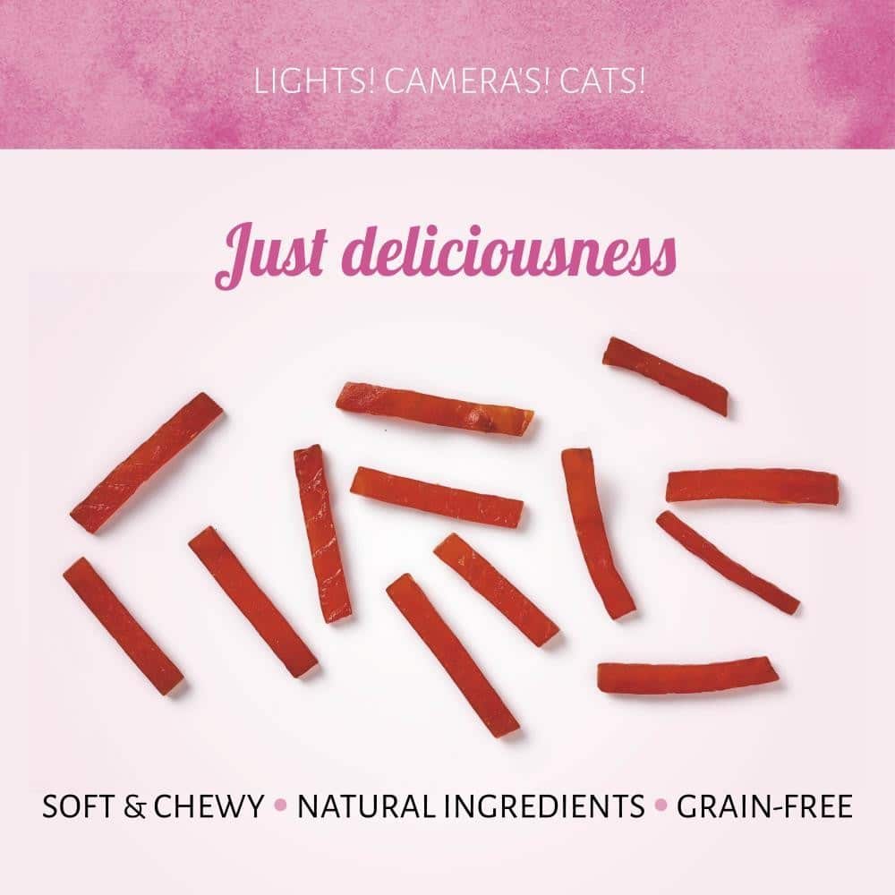 De zachte, gegrilde structuur maakt ze ideaal als tussendoortje of beloning tijdens het spelen. Dankzij de hoge vleesinhoud zijn ze bijzonder smaakvol en aantrekkelijk, zelfs voor de meest kieskeurige katten.