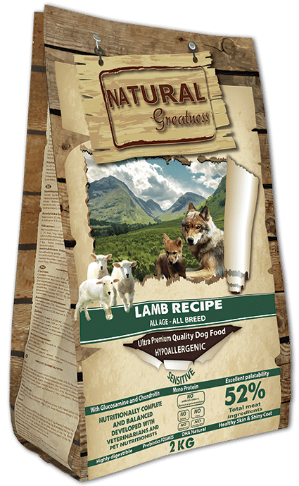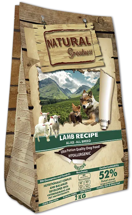 Natural Greatness Lamb Recipe  is hypoallergeen en humaan lamsvlees (mono-eiwit) geformuleerd zonder tarwe of granen, met een hoge verteerbaarheid en ideaal ontwikkeld voor honden van alle leeftijden en rassen met een gevoelige spijsvertering, of voor honden die graanvrije voedselrecepten nodig hebben. Alle ingrediënten zijn geselecteerd op hun lage allergeniciteit en hoge standaard kwaliteit, waardoor dit recept ideaal is voor honden of puppy’s die gevoelig zijn voor kippen- of ander vlees.