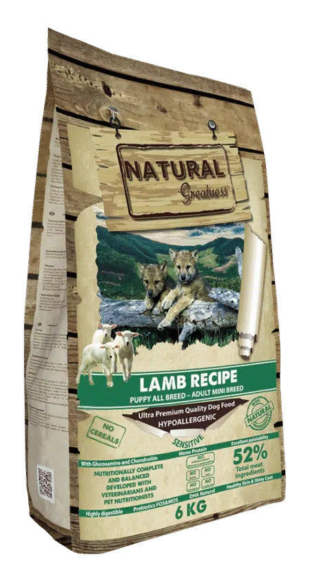 Natural greatness Lamb Recipe – Sensitive Mini is hypoallergeen en geproduceerd met lam van een kwaliteit die geschikt is voor menselijke consumptie (mono-eiwit), geformuleerd zonder granen of granenproducten, met een hoge verteerbaarheid en ideaal ontwikkeld voor honden van alle leeftijden met een gevoelige spijsvertering, of voor honden die graanvrije voedingsrecepten nodig hebben. Alle ingrediënten zijn geselecteerd op hun lage allergeniciteit en hoge standaardkwaliteit, waardoor dit recept ideaal is voor honden of puppy’s die gevoelig zijn voor kip of ander vlees.