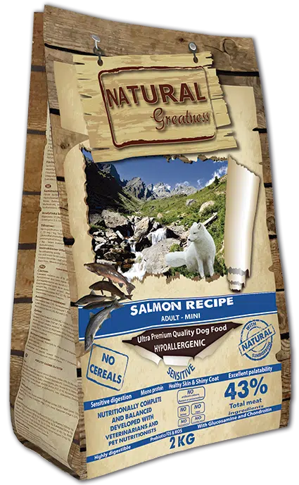 Natural Greatness Salmon Mini Recipe Sensitive is een hypoallergeen recept dat van goede kwaliteit zalm en aardappel gemaakt is zonder tarwe of maïs. Het product is specifiek gemaakt om aan de behoeften van de kleine hondenras te voldoen. Het is een complete voeding dat bij uitstek geschikt is voor volwassen honden met een gevoelige spijsvertering of voor honden die naar voedsel van hoge kwaliteit verlangen.