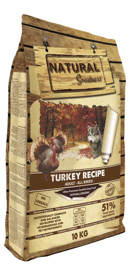 Natural Greatness Kalkoen Recept is een uitstekend hypoallergeen recept, ontwikkeld zonder granen, om aan de voedingsbehoeften van volwassen honden te voldoen.