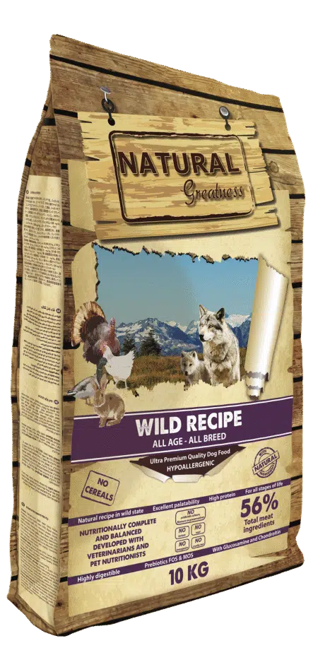 Natural Greatness Wild Recipe is een premium hypoallergeen hondenvoer dat speciaal is ontwikkeld om te voldoen aan de voedingsbehoeften van honden van alle rassen en leeftijden. Dit recept is volledig tarwe- en granenvrij, met een focus op natuurlijke en hoogwaardige ingrediënten, geïnspireerd door wat honden in het wild zouden eten.