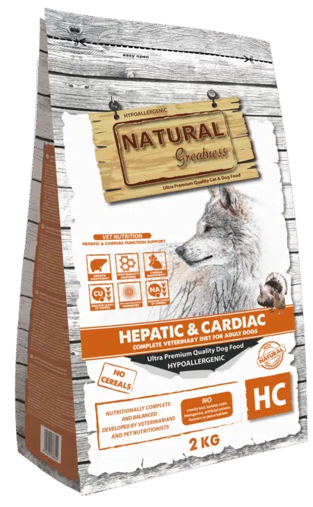 NATURAL GREATNESS Hepatic & Cardiac voor volwassen honden is een complete, hypoallergene en graanvrije receptuur voor volwassen honden van alle rassen. Deze hondenvoeding is ontwikkeld voor dieren met chronische leverinsufficiëntie die een dieet met een beperkte hoeveelheid koper nodig hebben om de belasting van de lever te verminderen. Dit voer onderscheidt zich door zijn hoge voedingsniveau, dankzij het rijke proteïnegehalte van het kip- en kalkoenvlees met een hoge biologische waarde. Deze eiwitten, zeer verteerbaar, garanderen een optimale instandhouding van de spiermassa en ondersteunen de leverfunctie. Bovendien is vanwege de lage zoutgehalte dit dieet ook aanbevolen voor honden met chronische hartinsufficiëntie, omdat het helpt bij het reguleren van de bloeddruk en het verminderen van waterretentie.