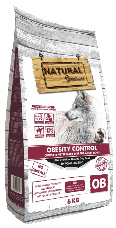 Natural Greatness Diet Vet Dog Obesity is een compleet, graanvrij, hypoallergeen recept bedoeld voor alle rassen van volwassen honden met overgewicht of obesitas die een strikt vetarm dieet nodig hebben om overgewicht te verminderen. Het recept bevat L-carnitine om geleidelijk gewichtsverlies te bevorderen en heeft een hoog natuurlijk vezelgehalte om de goede werking van de spijsvertering te bevorderen, waardoor de glycemische index na inname wordt verlaagd. Dit voorgeschreven voer bevat ook een hoog gehalte aan MSM, Glucosamine en Chondroïtinesulfaat om de gewrichten gezond te houden.