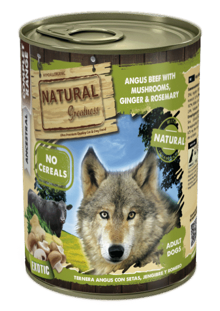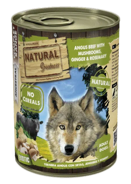 Natural Greatness Angus beef met Champignons, Gember en Rosemarijn recept is perfect voor het de meest veeleisende honden dankzij zijn hoge smakelijkheid. Dit recept is ideaal voor honden met overgewicht vanwege het lage vetgehalte.