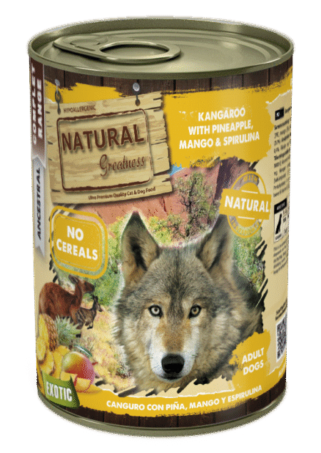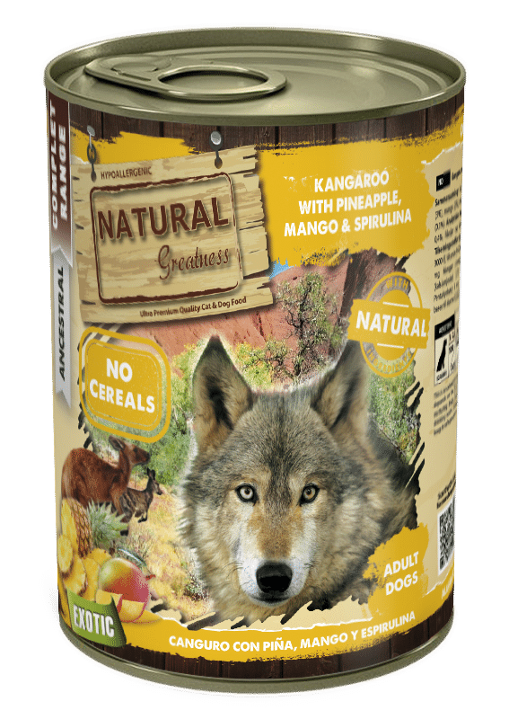 Natural Greatness Kangaroo met ananas, mango en Spirulina Recept, bevat kangoeroevlees als enige eiwitbron. Kangoeroevlees is vetarm, eiwitrijk en bevat ook veel vitaminen en mineralen. Kangoeroes grazen een grote verscheidenheid aan wilde kruiden, struiken en bomen, en als gevolg van deze verscheidenheid, heeft hun vlees een breed scala aan macro- en micronutriënten.