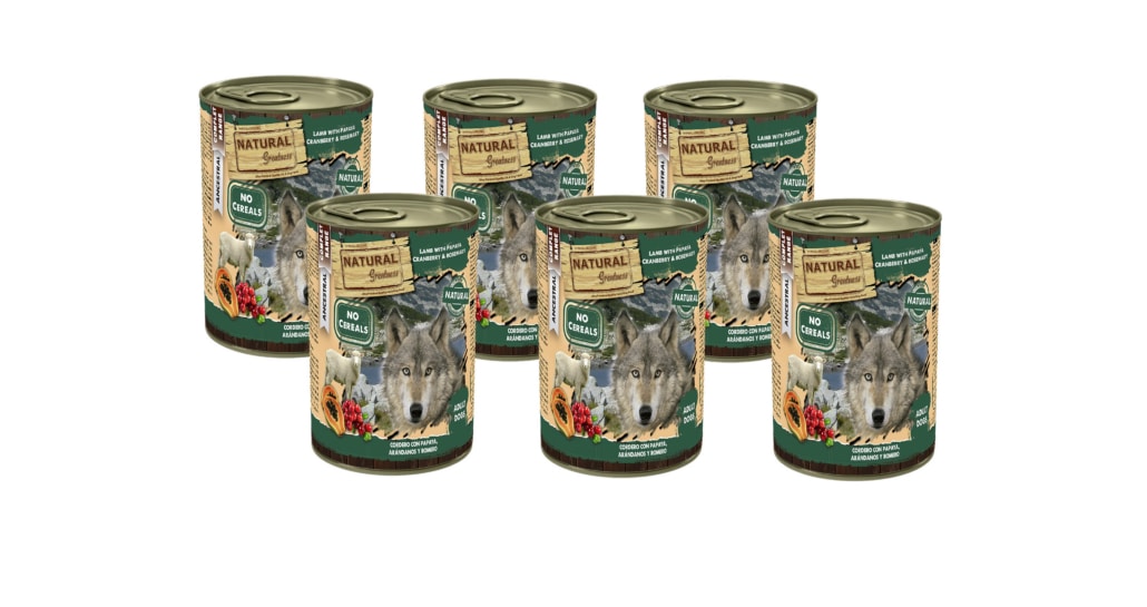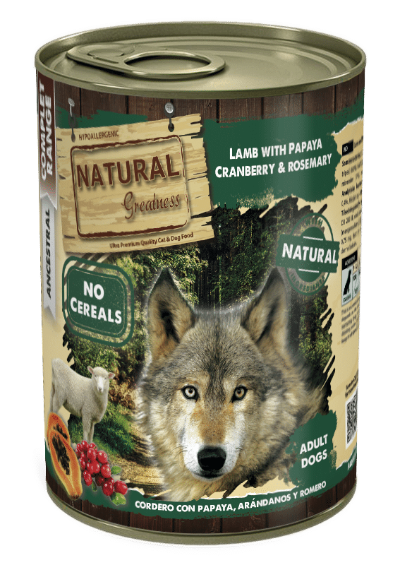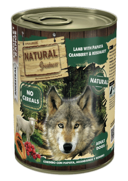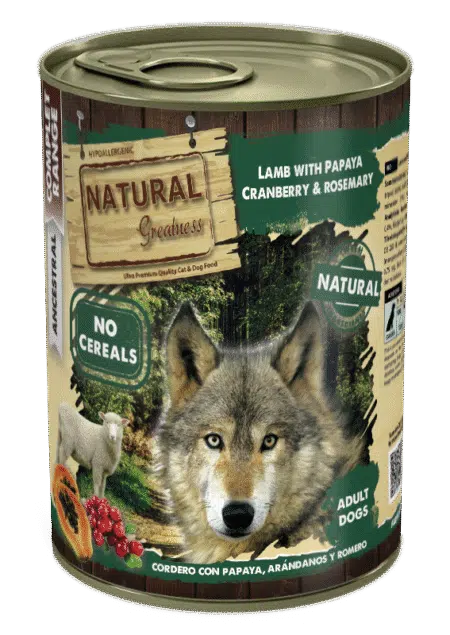 Ontdek de heerlijke Natural Greatness “Lamb with Papaya, Cranberries & Rosemary” – een natuurlijke, graanvrije maaltijd voor honden met slechts één dierlijke eiwitbron: lam. Perfect voor honden met een gevoelige spijsvertering of voedselintoleranties.