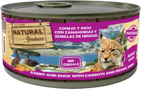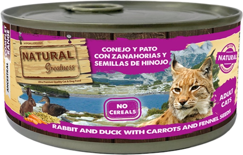 De Natural Greatness Rabbit/Duck With Carrots And Chamomile 185 gr kattenvoeding is volledig graanvrij natvoer voor de kat zonder kunstmatige toevoegingen met natuurlijke ingrediënten. Deze heerlijke kattenvoeding bevat een mix van hoogwaardige en gezonde vleessoorten uit eend en konijn. Daarnaast zal jouw kat smullen van de wortel en kamille in dit natvoer! Wortel zit boordevol vitamine A, C en K. Ook bevat het veel kalium en vezels. Zo kan het de huid en het zichtvermogen ondersteunen. Kamille heeft een rustgevend effect. Zo kan het krampstillend, gas verlichtend en kalmerend werken.