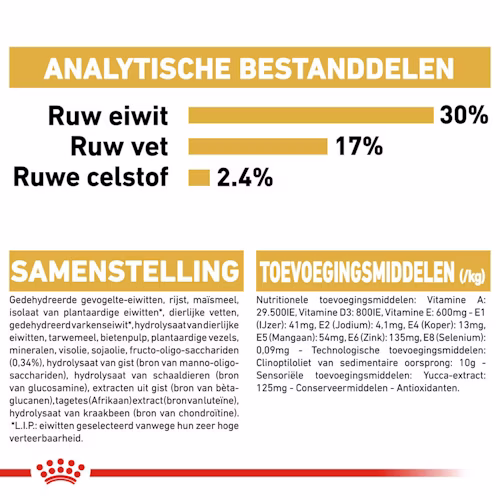 Een Bulldog-pup groeit snel, maar niet zonder uitdagingen. 🐶 Royal Canin English Bulldog Junior Dry is speciaal ontwikkeld om jonge English Bulldogs te ondersteunen tijdens hun intensieve groeifase. Deze voeding helpt bij een gezonde bot- en gewrichtsontwikkeling, ondersteunt een gevoelige spijsvertering en draagt bij aan een sterke huidbarrière. De aangepaste brokvorm is perfect afgestemd op de korte snuit, zodat eten makkelijker en rustiger verloopt.